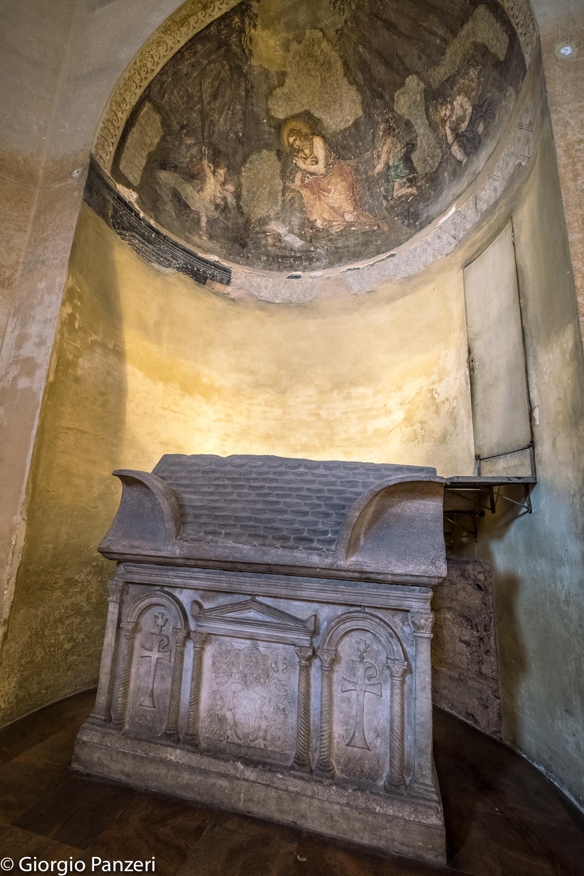 Il sarcofago: per le sue dimensioni monumentali la tradizione cinquecentesca ne fa la tomba della regina bizantina Galla Placida, sposa di Ataulfo, re dei Visigoti morto a Barcellona nel 415.