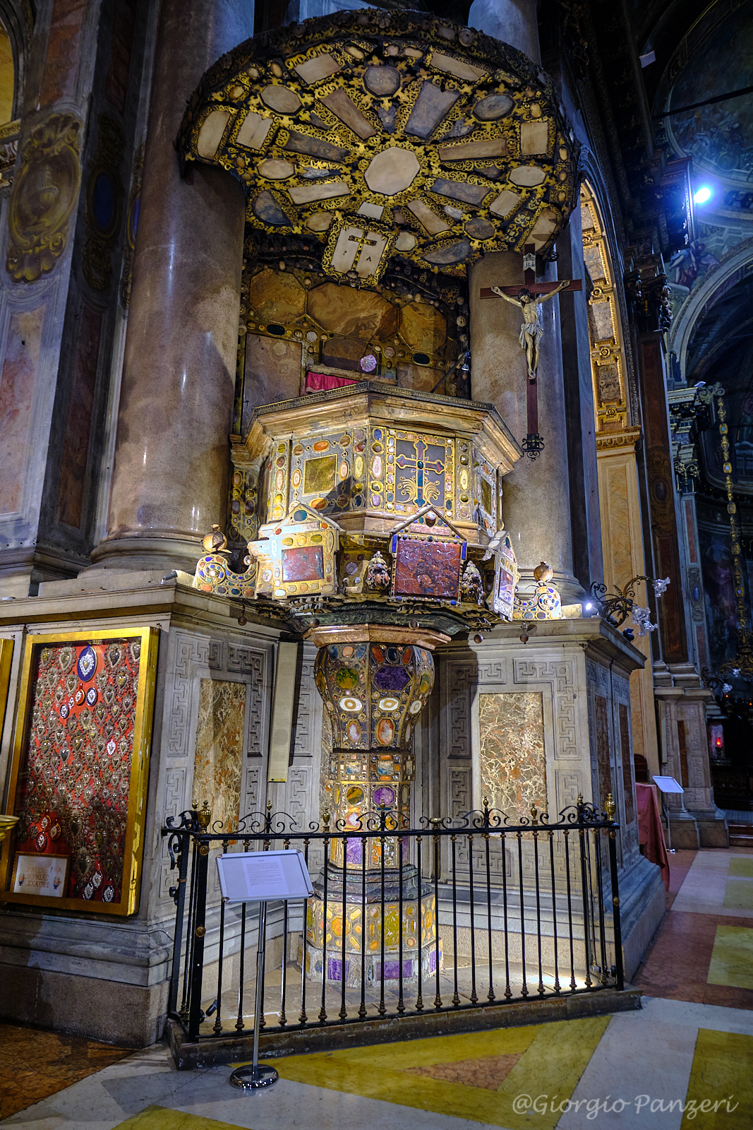 Il pulpito e i due confessionali posti di fronte all’altare maggiore sono spettacolari esempi d’arte barocca, interamente rivestiti da pietre dure intagliate. Risalgono al 1661, e sono attribuiti al celebre intagliatore Carlo Garavaglia, anche se in assenza di fonti specifiche.