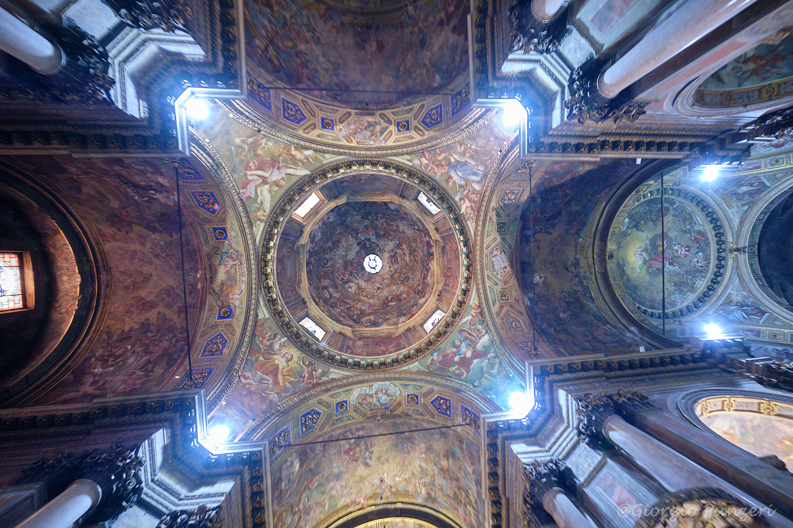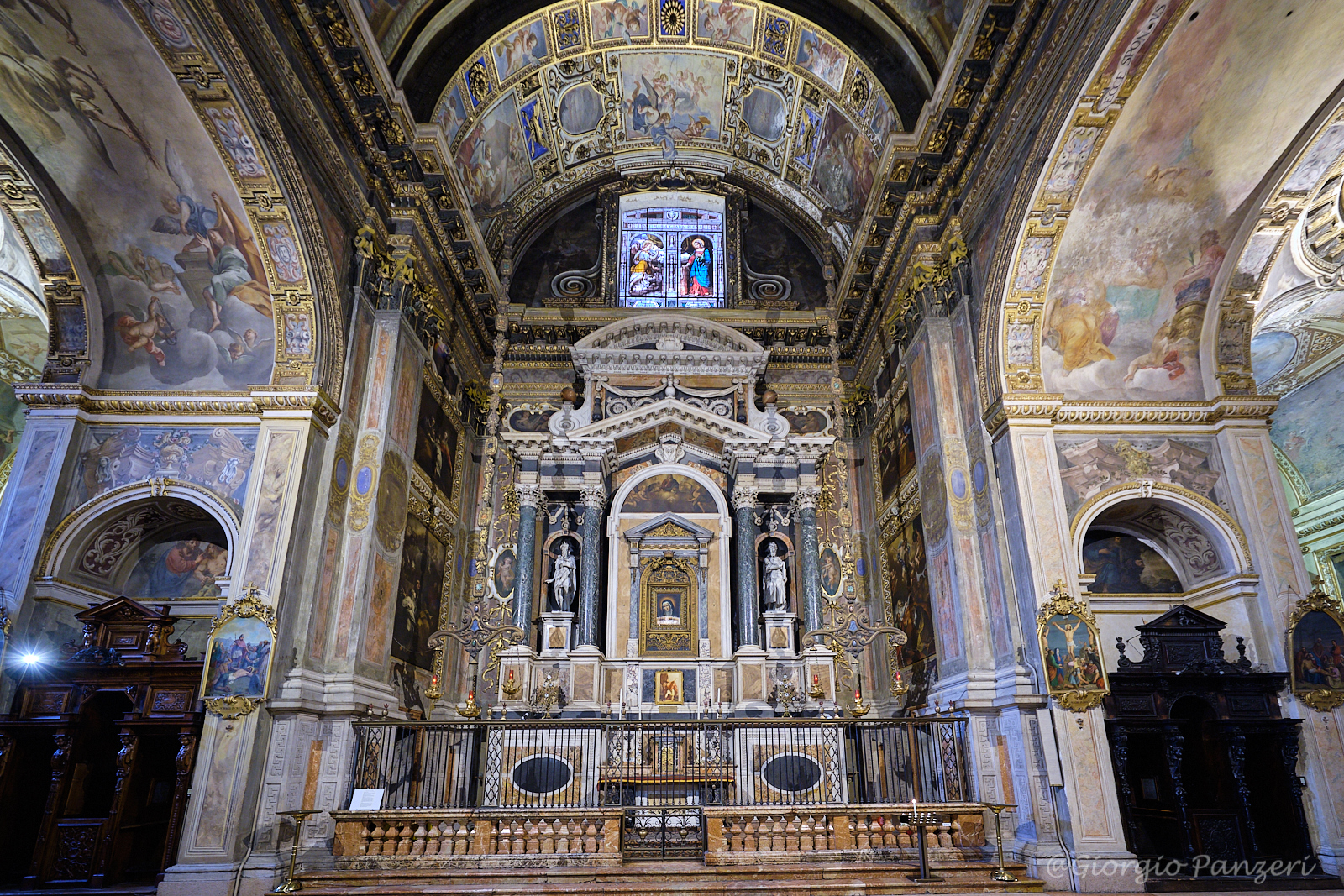 Il vastissimo ciclo di pittura ad affresco che ricopre completamente gli arconi, i voltini, e le sette cupole minori, ha il suo culmine nella cupola maggiore che rappresenta il Paradiso. Fu compiuta in quattro anni (1693-1697) da Filippo Abbiati e Federico Bianchi, con l’aiuto di Martino Cignaroli ed altri. Nei pennacchi è l’inconsueta rappresentazione di quattro virtù, Agilità, Sottigliezza, Impassibilità e Chiarezza.