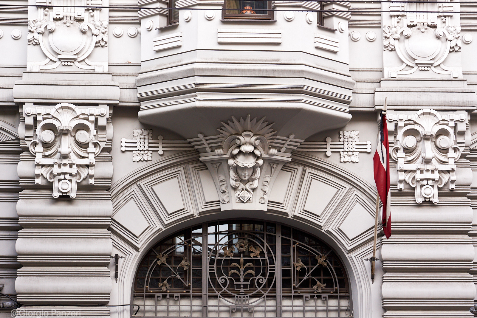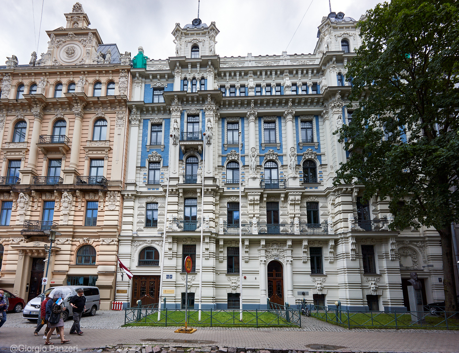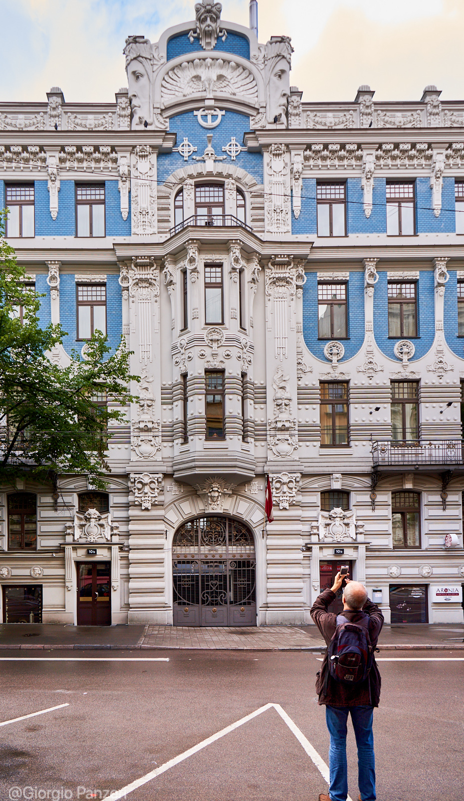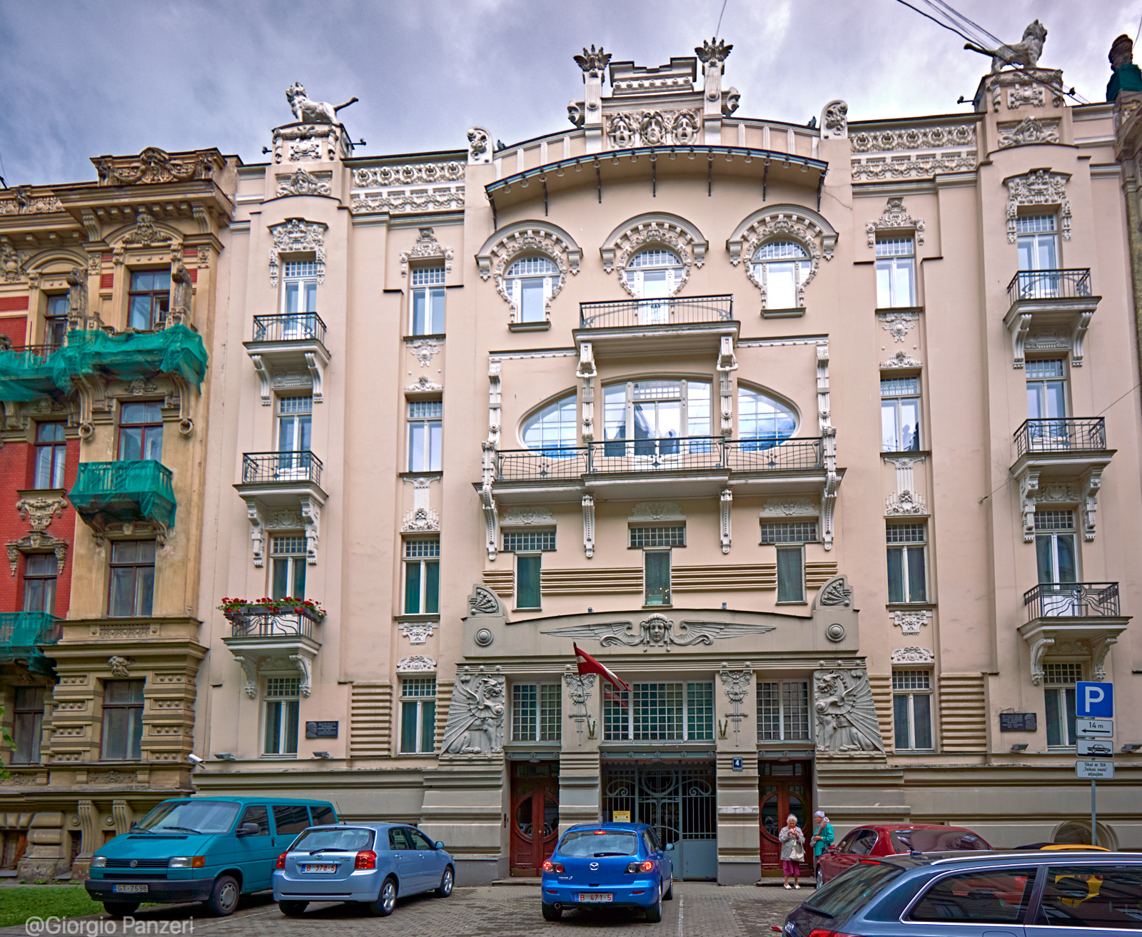 “Elizabetes iela” fiancheggia invece in parte un vasto parco ed è la via in cui si trova, al numero 10b, il più celebre palazzo Art Nouveau di tutta Riga. Costruito nel 1903 su disegno dell’immancabile Ejzenštejn, raggruppa tutte le caratteristiche del particolare Jugendstil eclettico righese, a cominciare dall’accostamento di colori azzurro-bianco, dalle figure mitologiche (mascheroni con teste di Medusa) e dalla profusione di aquile, ghirlande ed elmi.