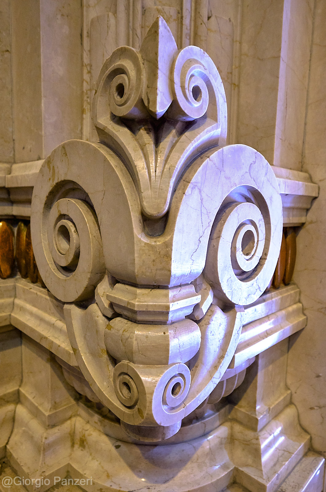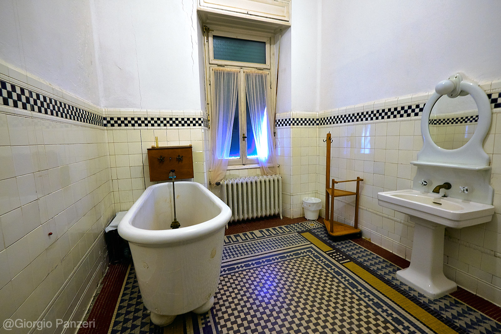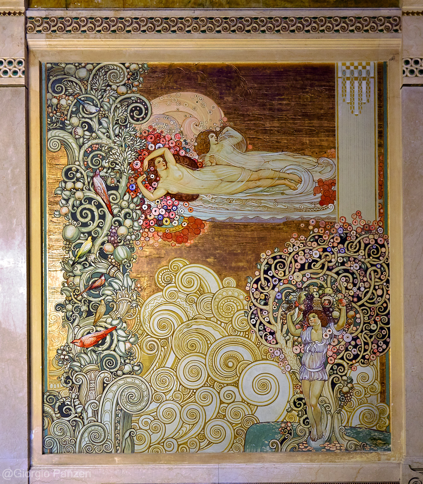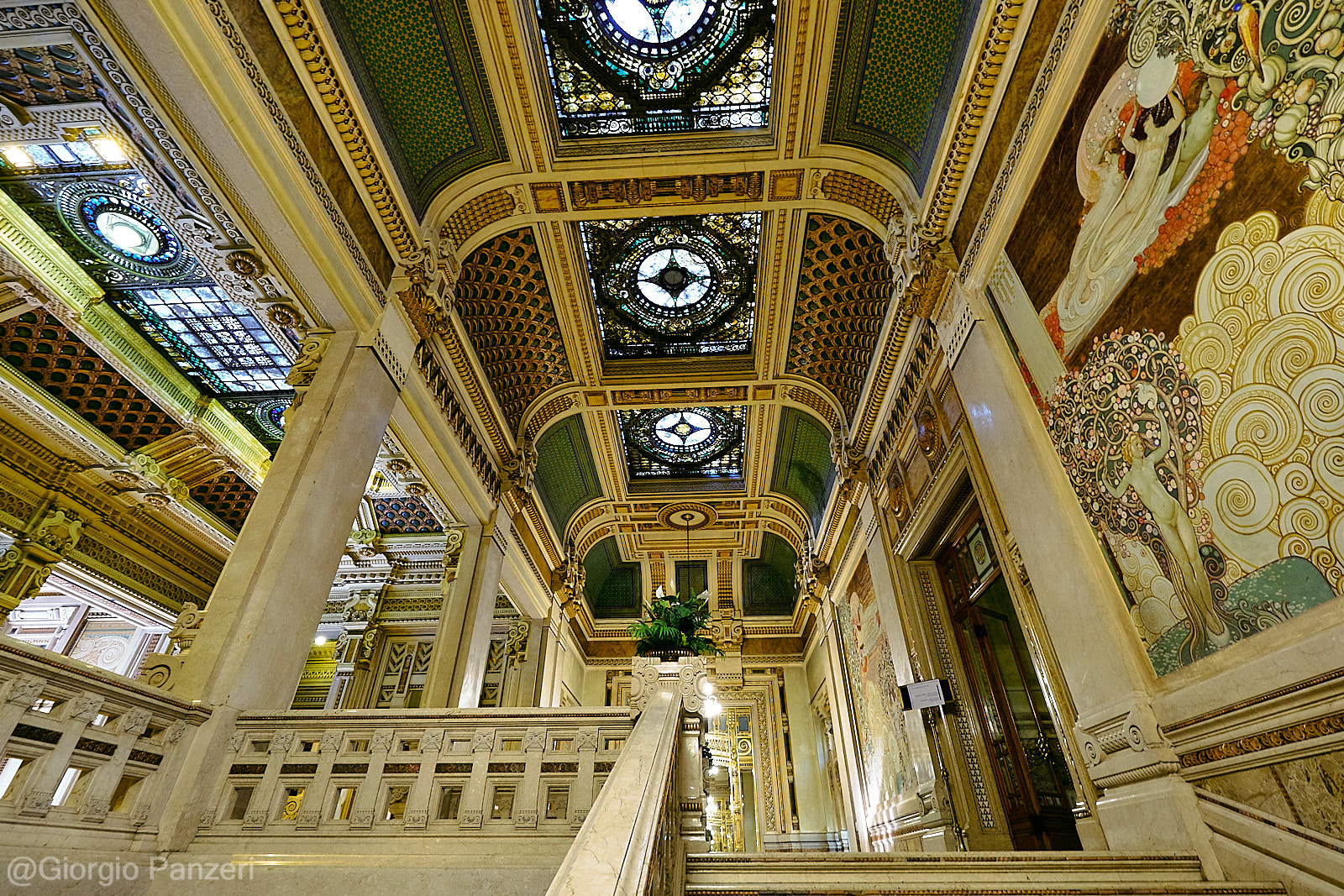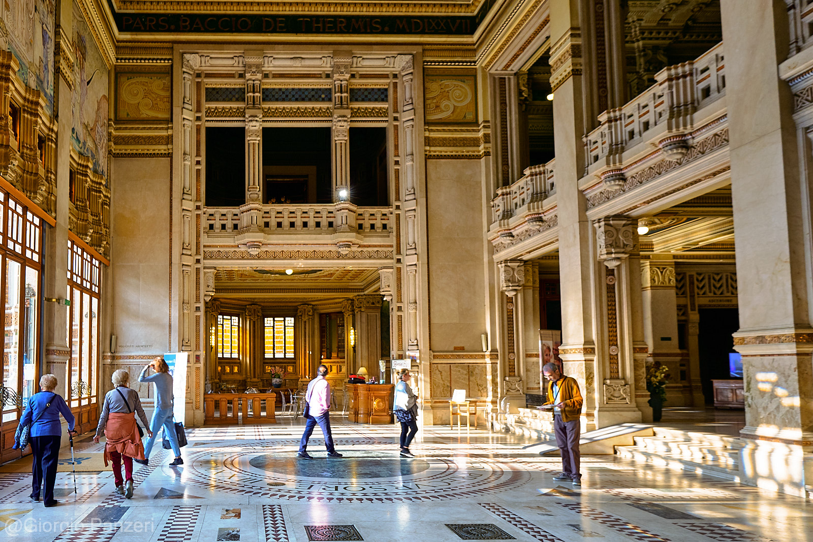 Dall’ampio atrio si accede a un grande salone rettangolare, aperto sul doppio scalone monumentale, decorato in sommità da rosoni in stucco e vetrate colorate; i due pianerottoli sono inoltre arricchiti da grandi specchi con cornici ornate in stucco e metallo. Il primo piano, sulle cui pareti si stagliano due dipinti raffiguranti l’Autunno e la Primavera, realizzati nel 1922 da Galileo Chini, si affaccia con un loggiato e due bow-window sull’imponente ingresso, coperto da una grande vetrata blu e verde. (Fonte Wikipedia)