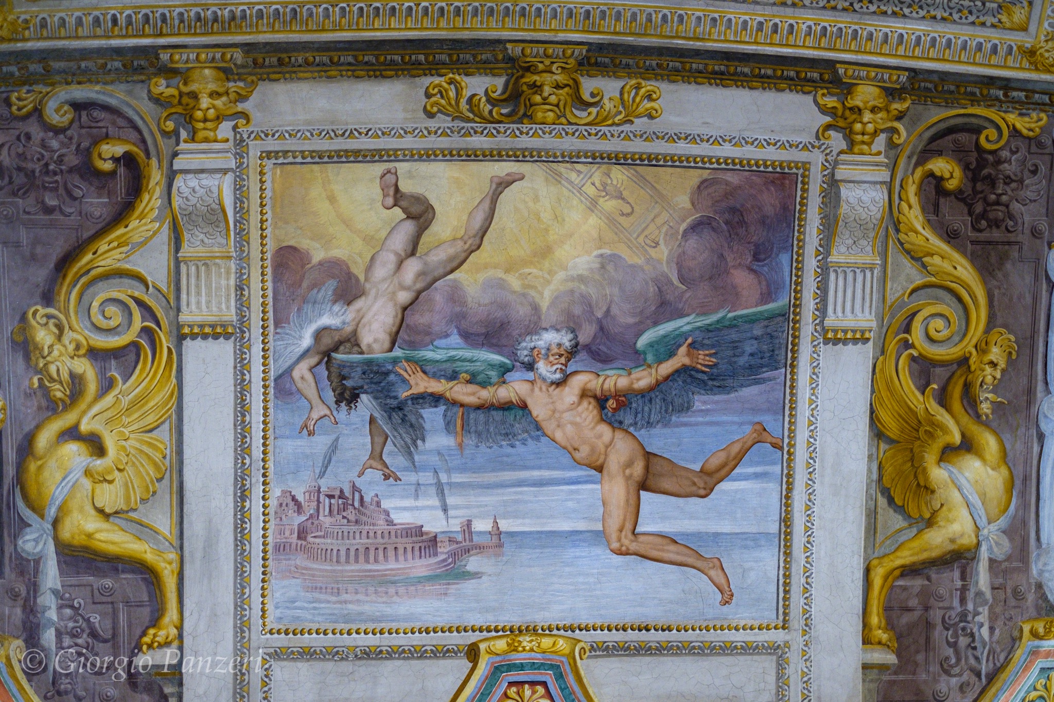 Un nuovo monito a coloro che si oppongono ai potenti è invece il messaggio impresso nella Sala dei Giganti che come punizione, per aver sfidato Giove, vengono precipitati dall’Olimpo. Nei quadrati laterali alla chiave di volta si riconoscono le vicende di Prometeo che ha rubato il fuoco al Sole e per questo è legato a una rupe, dove un avvoltoio gli mangerà in eterno il fegato; oppure il mito di Fetonte fulminato da Giove e precipitato nell’Eridano, perché con ostinazione volle guidare il cocchio del padre; o ancora i figli di Niobe che vengono uccisi per punire la loro madre che richiese sacrifici al posto di Latona; e infine Icaro che nel tentativo di volare, sfiora il Sole e precipita così nel mare.