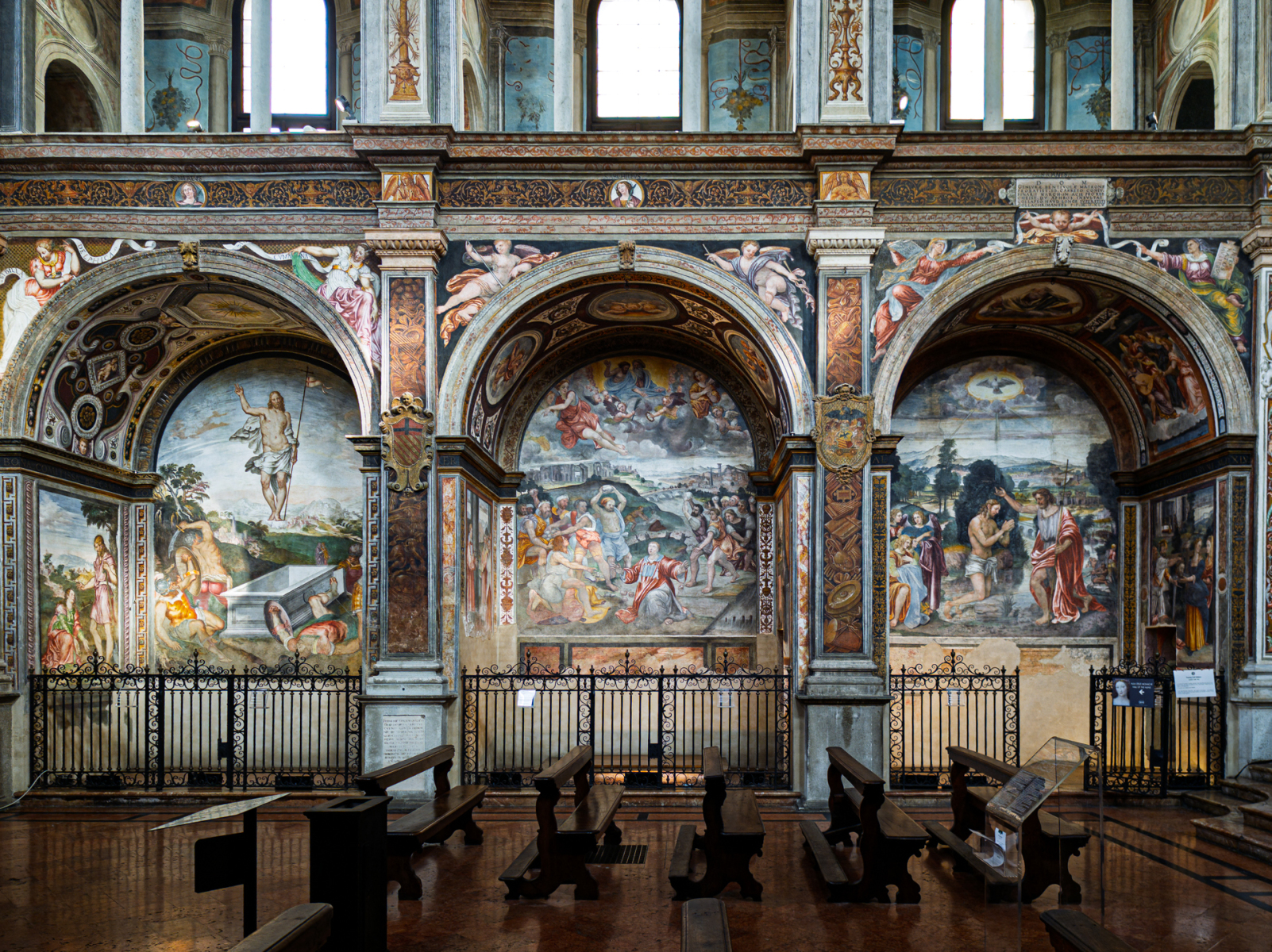 Se il tramezzo che divide in due la chiesa è già un elemento caratterizzante, quello che colpisce è il ciclo di affreschi che ricopre tutte le mura e le cappelle della chiesa, gli stucchi, i dipinti. Dietro tutto c’è il genio di Bernardino Luini, della sua scuola e dei suoi figli che terminarono il lavoro dopo la sua morte. Vi sono riprodotte storie di santi, parabole, episodi della vita di Cristo ed episodi biblici. E poi la controfacciata ornata da due affreschi di Simone Peterzano, noto ai più per essere stato il maestro di Caravaggio e uno degli esponenti del tardo manierismo lombardo.