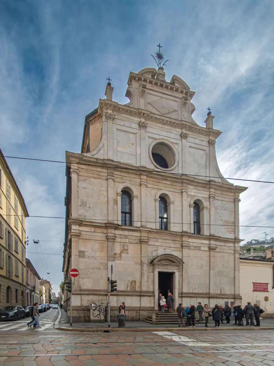 La chiesa fu costruita nel 1503 come luogo di culto per le monache di clausura, che non potevano entrare in contatto con il pubblico, ma anche per parenti e cittadini milanesi. Ecco allora la singolare divisione in due metà: quella verso la strada – la parte pubblica – è separata da un tramezzo dal cosiddetto Coro delle Monache, riservato alle sole religiose (che sentivano Messa e si comunicavano grazie a una grata posta sul tramezzo stesso).