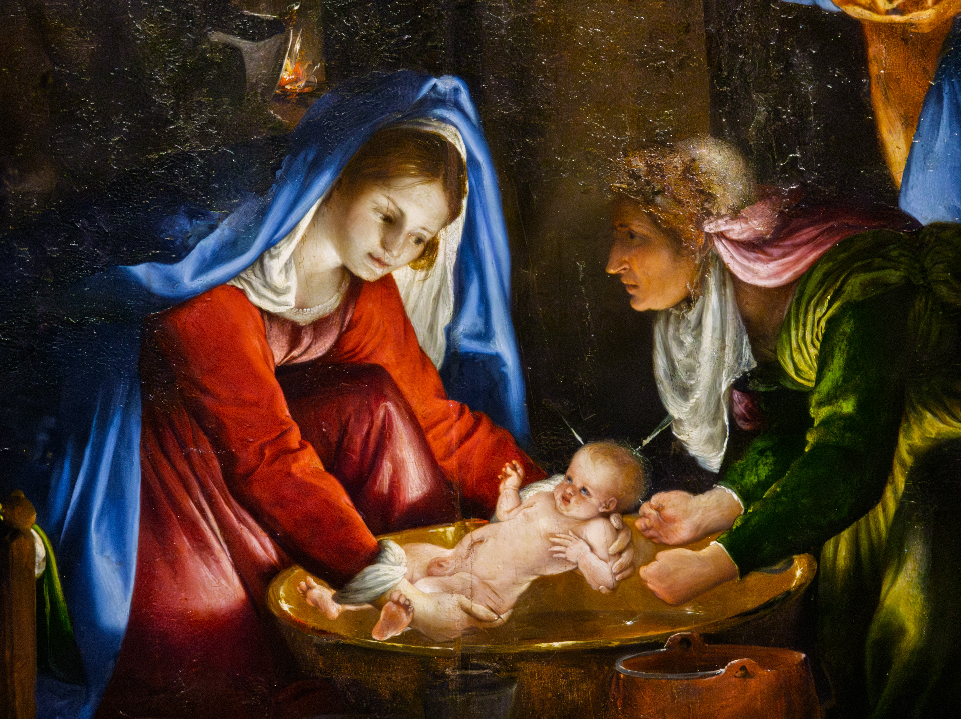 Questa natività si differenza decisamente da quelle classiche. Oltre alla presenza della levatrice non c’è il classico pagliericcio dove è adagiato il piccolo ma c’è una bacinella (in realtà un grosso paiolo per la polenta) riempito d’acqua e Maria sta immergendo Gesù per lavarlo. La presenza del cordone ombelicale rappresenta l’umanità di Cristo che come tutti i bimbi inarca la schiena per non entrare nell’acqua. Un capolavoro da non perdere.